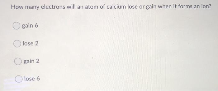 Calcium loses 2 electrons when it becomes an ion. Chemistry questions and answers. 2 electrons lost to go to the calcium ion.